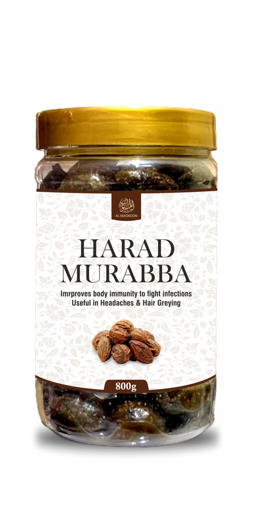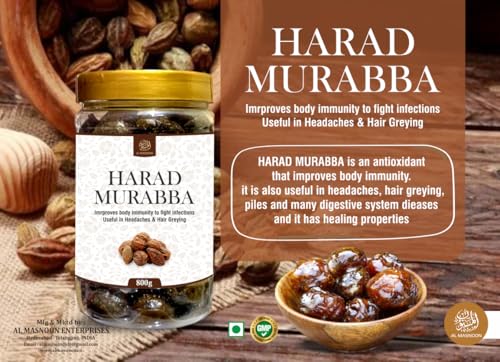 Al Masnoon Harad Murabba / Haleela Murabba 800g pack of 1 is a cherished traditional preserve made from premium quality harad (Terminalia chebula) fruits. Known for its rich medicinal properties harad murabba is believed to promote digestive health and overall well-being. It combines the natural sweetness of harad fruits with a tangy flavor making it a delightful treat for all ages. Enjoy it as a standalone snack or as a complement to meals benefiting from its nutritional value and potential health advantages.