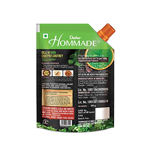 Dabur Hommade Dilli ki Hari Chatpati Chutney is crafted with the right touch of spices and multiple choiciest ingredients to complement your regular meals or snacks with tangy zingy and spicy flavour notes.It is the perfect accompaniment to your chaat samosas biryanis paranthas any more snack items. So enjoy the finger lickin delicious range of Dabur Hommade Chutneys made just for you !