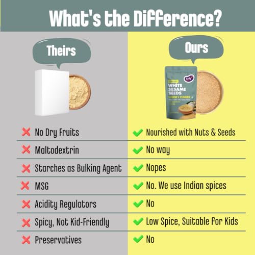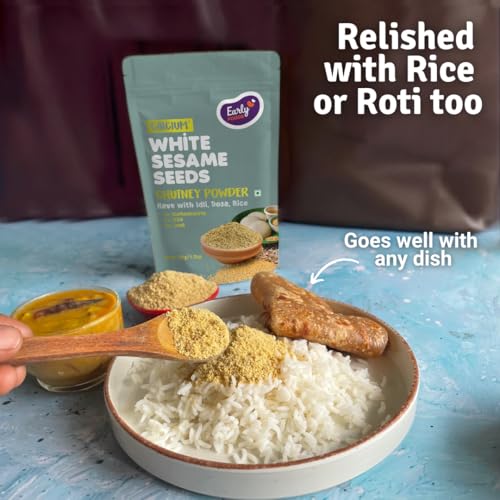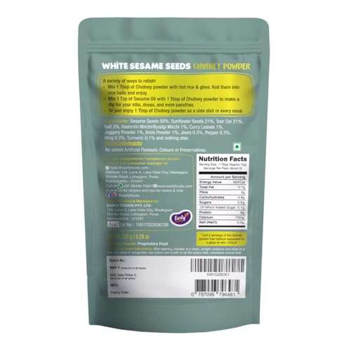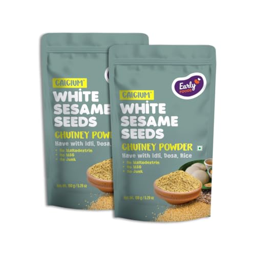 Sesame Seeds Chutney Powder 150 gms. Pack of 2. Freshly handmade Sesame Seeds chutney powder for all Rich in Calcium. Fabulously delicious meal time Just 2 Servings of Chutney Powder has Calcium equivalent to a glass of milk (100 ml) Ingredients include sesame seeds 44% sunflower seeds 44% curry leaves red chilli powderwood pressed coconut oil rock salt hing and nothing else No Preservatives or Artificial Flavours. Shelf life: 2 Months Why Moms love Early Foods: Made from ancient Indian Super Foods We make really small batches of food each day. So you can always feed super fresh meals. Grandma inspired recipes simple healthy with minimal processing No Preservatives colors or artificial flavors. All Natural