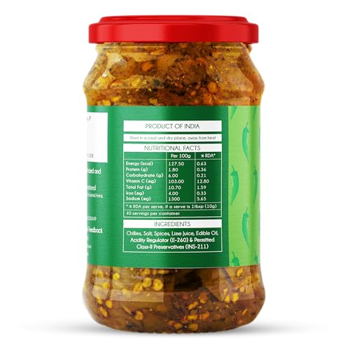 Our Chatpati Green Chilli Pickle is a curation of utmost quality ingredients with many nutritional benefits. Green Chillies have always been consumed as a traditional medicinal herb for it's superior congestion clearing pain relieving and blood cholesterol reducing abilities. This pickle also helps people with stomach ulcers ease digestion and reduce weight. Mixed with different spices this tasty pickle is all you're looking forward to eating all day long.