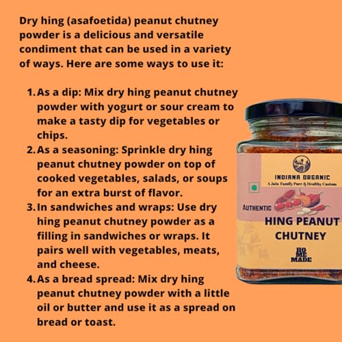 Ingredients: RED CHILI ROCK SALT PEANUT AMCHUR CUMIN SEED ASAFOETIDA & MINT LEAVES.