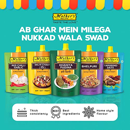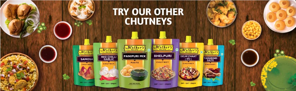 Mother's Recipe Tamarind Date ChutneySavour your favourite snacks with the tang of Tamarind and sweetness of Date with our Tamarind Date Chutney.Bhelpuri ChutneyMake your home made bhelpuri more delightful by seasoning it with our tangy bhelpuri chutney.Delhi Chaat ChutneyPour this chutney over your homemade chat and bring the authentic taste of Delhi street side chaat to your table.