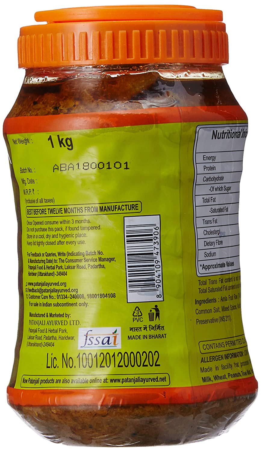 Pickle from Patanjali is another additional good thing since it is a brand that offers products typically based on the principles of Ayurveda. Rich In Vit C It helps to drop down the blood sugar level by Facilitates the proper absorption of insulin.It increases the body's immune system and prevent from common cough and cold.Help full in hair fall control.long shelf-life because of high mustard oil content (10-12)% meanwhile other products in the market have only 3- 4 % of oil.Mango,lime,Mustard oil,Carrot,Edible Common Salt,Green Chilli,Mixed Spices((fennel, yellow mustard, red chilli powder, cumin powder, fenugreek seed powder, coriander powder, kalonji, cinnamon powder, asafoedita, cardamom powder),Ginger,lotus Stem,Dela and Preservatives.