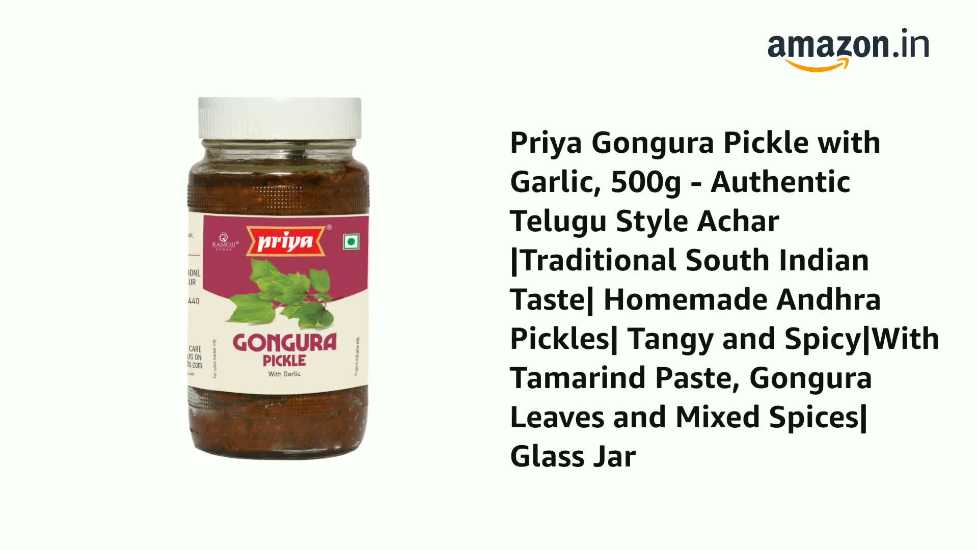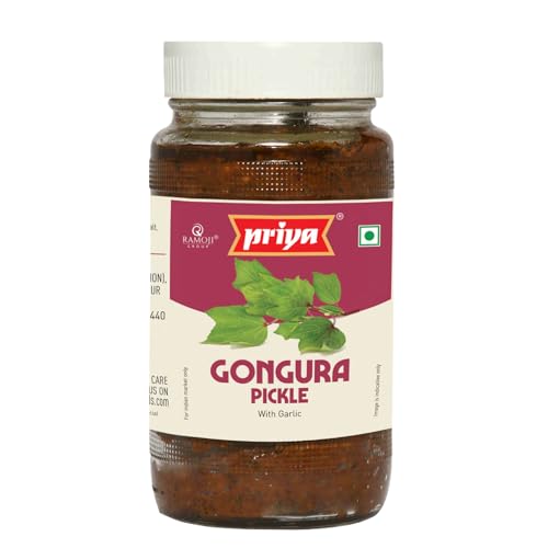 Priya Gongura Pickle with Garlic, 500g - Authentic Telugu Style Achar |Traditional South Indian Taste| Homemade Andhra Pickles| Tangy and Spicy|With Tamarind Paste, Gongura Leaves and Mixed Spices| Glass Jar