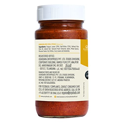 Pair your food with our delicious gongura lal mirch achaar to make a delicious meal. Whether you're travelling at home or at the office our gongura lal mirchi achaar will make the perfect zesty companion for your dishes. Ingredients: Gongura Leaves Red Chilli Paste Refined Rice Bran Oil Iodized Salt Tamarind Extract Mixed Spices Mustard Seeds Dry Chillies and Curry Leaves. Nutrition: We at Priya Foods have successfully integrated traditional science with modern-day scientific manufacturing. Our gongura lal mirch achar has wholesome ingredients from our kitchen like tamarind which is a rich source of magnesium potassium phosphorus and iron. Mustard seeds which are one of the richest sources of alpha linolenic acid that forms essential omega fats in our body. Curry leaves which are one of the richest sources of iron calcium zinc selenium and numerous antioxidants. The refined rice bran oil in our pickle contains Oryzanol content which is a natural antioxidant. Why choose Priya Foods? Priya Foods is a legendary brand started in 1980 and is a household name primarily in South India famous for its pickles and chutneys. Along with international recognised Food Safety Management System certifications with commitment towards hygiene and safety. It strives to consistently bring to you tasty mouthwatering pickles which will remind you of home. Priya Foods has successfully taken the goodness of South Indian pickles all over the world!