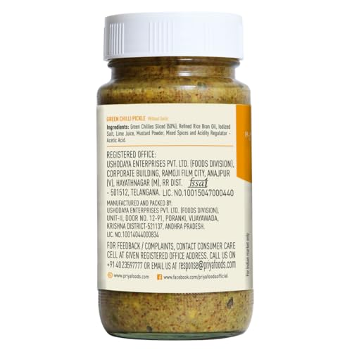 Complete every meal at home or at the office with this delicious mirchi ka achar (without garlic) from the legendary brand Priya Foods and get transported back to your childhood. This achaar is a lovely twist to the fresh hari mirch - a spice lovers delight! Ingredients - Sliced green chillies refined rice bran oil iodized salt lime juice fenugreek powder turmeric powder acetic acid & mixed spices. Nutrition - We at Priya Foods have successfully integrated traditional science with modern-day scientific manufacturing. Our green chilli pickle contains wholesome ingredients from our kitchen like carefully selected chilli. Fenugreek known for diabetic management and having a positive effect on digestive health. Turmeric which has anti-inflammatory effects and is a very potent antioxidant. Lime juice which has the highest percentage of Vitamin C. Why choose Priya Foods? Priya Foods is a legendary brand that started in 1980 and is a household name primarily in South India famous for its pickles and chutneys. Along with international recognised Food Safety Management System certifications with a commitment towards hygiene and safety. It strives to consistently bring to you tasty mouth watering pickles which will remind you of home. Priya Foods has successfully taken the goodness of South Indian pickles all over the world!