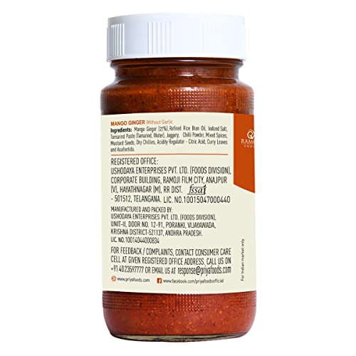 Pair your food with our mango ginger achaar to make a delicious meal. Whether you're travelling at home or at the office our mango ginger achaar will make the perfect zesty companion for your dishes. Ingredients: Mango Ginger Refined Rice Bran Oil Iodized Salt Tamarind paste (Tamarind Water) Jaggery Chilli Powder Mixed spices Mustard Seeds Dry Chillies Acidity Regulator - Citric acid Curry leaves and Asafoetida. Nutrition: We at Priya Foods have successfully integrated traditional science with modern-day scientific manufacturing. Our Mango Ginger Pickle contains wholesome ingredients from our kitchen like refined rice bran oil that contains Oryzanol content which is a natural antioxidant. Jaggery which helps in maintaining blood pressure and acts as a great source of energy. Mustard seeds that contain the beneficial alpha-linolenic acid that forms essential omega fats in our body. Asafoetida is known to have a positive effect on digestive health. Why choose Priya Foods? Priya Foods is a legendary brand started in 1980 and is a household name primarily in South India famous for its pickles and chutneys. Along with international recognised Food Safety Management System certifications with commitment towards hygiene and safety. It strives to consistently bring to you tasty mouthwatering pickles which will remind you of home. Priya Foods has successfully taken the goodness of South Indian pickles all over the world!