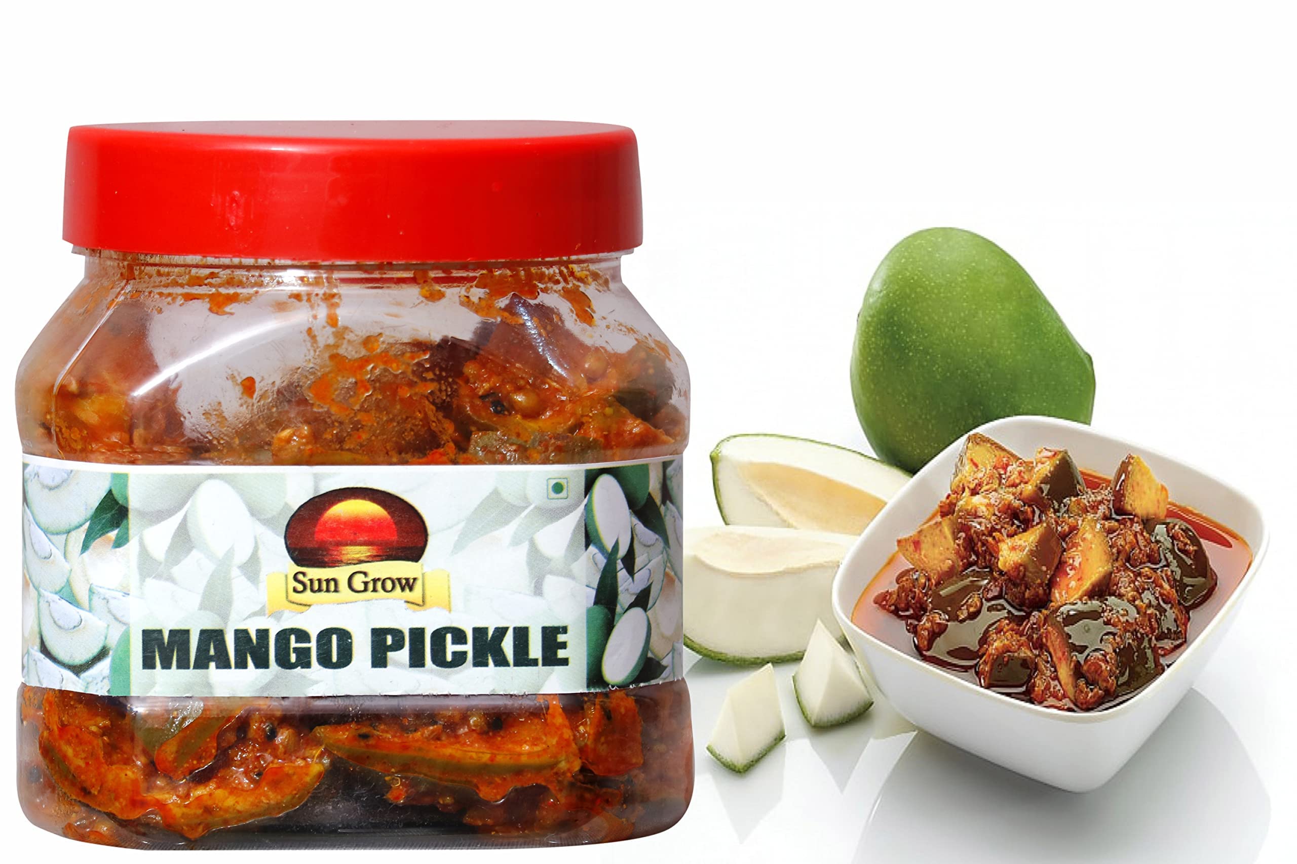 Raw Mango Pickle Chunky pieces of raw mango pickle is a must-have for a typical Indian breakfast and preserves the goodness of this summer fruit, served in its traditional salt and sour form. Containing Vitamin A and C, Calcium, Iron and Magnesium, raw mango pickle eases digestion, controls constipation and softens the skin making it breathe and healthy. 100% Organic Food With Fresh Season Mangoes An Appetizer with every kind of foods