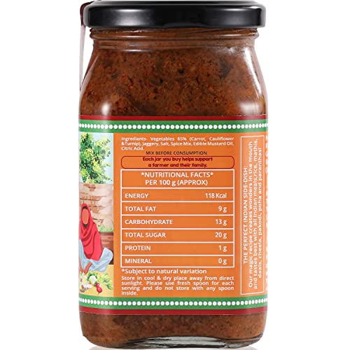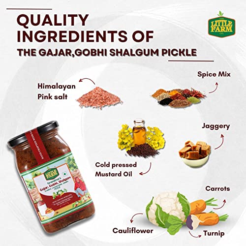 • BEST QUALITY INGREDIENTS : Made in cold pressed mustard oil Pink salt natural spices jaggery and sugarcane vinegar from our own farms in Madhya Pradesh. Farm to fork no middleman! Ingredients : Gobhi Shalgum carrots red chilli himalayan pink salt garam m