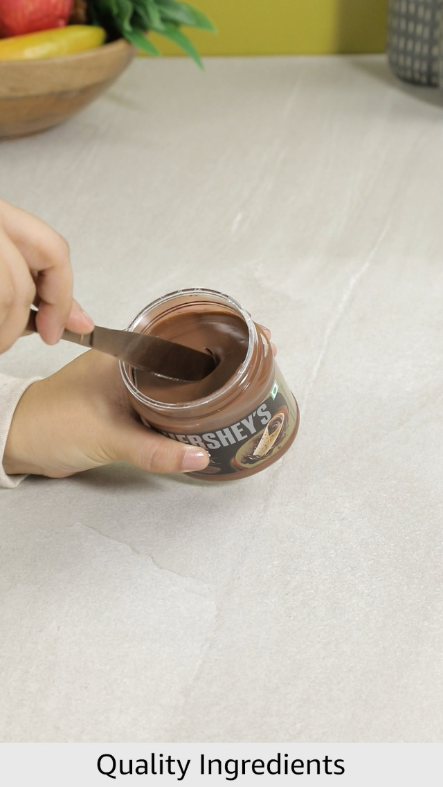 Presenting Hershey's Spreads! Enjoy the delectable taste of chocolate with the goodness of real almonds. Enjoy the delicious taste of Hershey's spreads with bread roti paratha idli dosa cake biscuit fruit waffle doughnut croissant and much more. Spread the happiness with Hershey's!