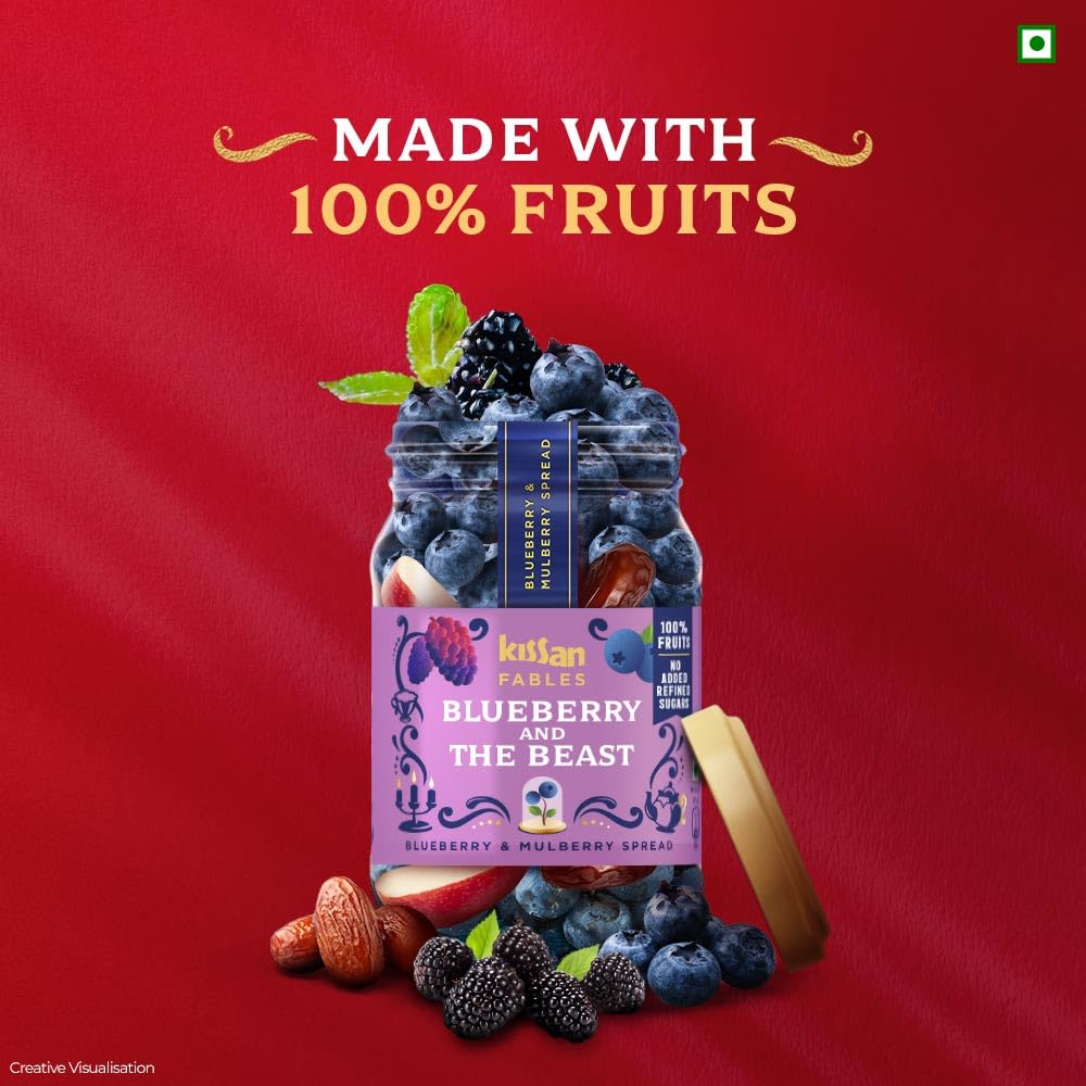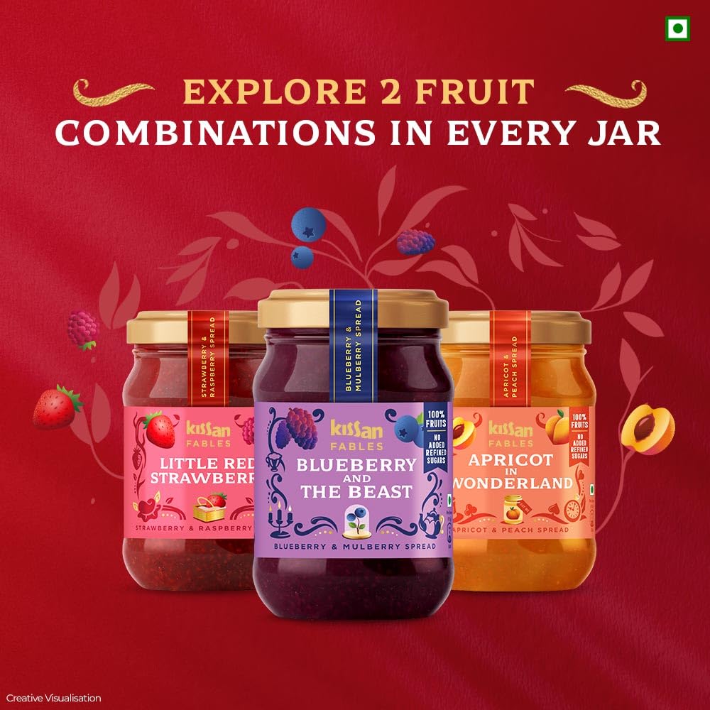 From the house of Kissan we bring you Kissan Fables - a premium fruit spread where each pack is a storybook telling a fable of magical fruits and unique combinations. A story of 100% fruits and nothing else. Carefully crafted recipe that has just 5 ingredients and that too all from fruits! Including natural sweetness that comes just from fruits. No added refined sugars at all just fruit & fruit and only fruits! And not to our surprise no nasties at all - No added colours preservatives flavours and of course not even refined sugar. Each variant is carefully crafted with unique fruit combinations to give you the best flavour and is gently cooked to retain fruitsâ original taste flavour and colours. Tastes amazing with bread roti pancakes or may be with vanilla ice-cream or cheese cake and tell us if you try anything else we'll recommend it to others too. And as a proof of how this product is just 100% fruit and literally nothing else not even preservatives if you keep the product outside fridge after opening it youâll see fungus on it just like how you see it on real fruits. Hence we recommend refrigerating it after opening.