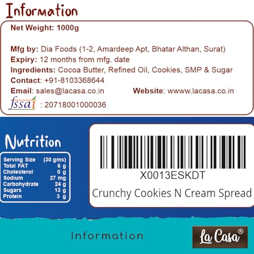 La Casa Crunchy Cookies N Cream Spread | Made in India | 1kg |