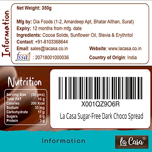 La Casa Sugar-Free Dark Chocolate Spread | Stevia Based | All Natural | Product of India | 350g |