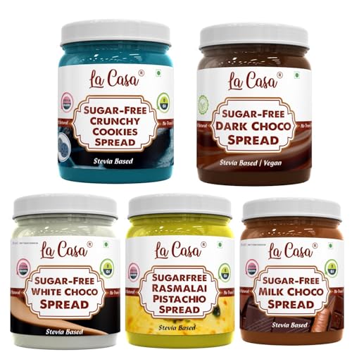 La Casa Sugar-Free White Choco Milk Choco Crunchy Cookies Dark Choco Rasmalai Spread | Stevia Based | 100% Natural with added crunchies | Product of India | Combo of 5 | 5x350g