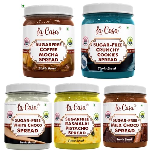La Casa Sugar-Free White Choco Milk Choco Crunchy Cookies Roasted Cream Cheese Rasmalai Spread | Stevia Based | 100% Natural with added crunchies | Product of India | Combo of 5 | 5x350g