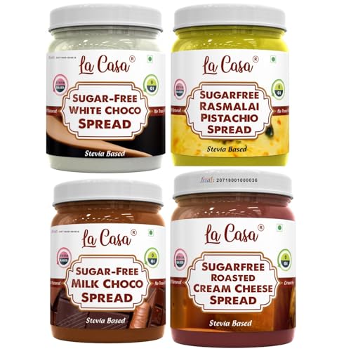 La Casa Sugar-Free White Choco Roasted Cream Cheese Milk Choco Rasmalai Spread | Stevia Based | 100% Natural with added crunchies | Product of India | Combo of 4 | 4x350g