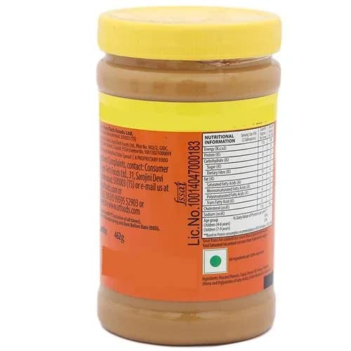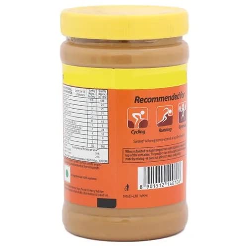 Sundrop Peanut Butter is a tasty bread spread made of roasted peanuts (90% by weight). It is healthy for everyone in the family because it has zero cholesterol and zero trans-fats. Sundrop Peanut Butter is a power packed spread loaded with proteins (25% of each serving is made up of proteins). You get as much proteins from 11/2 tablespoons (24g) of Sundrop Peanut Butter as from a large glass of Cow's Milk (200 ml).