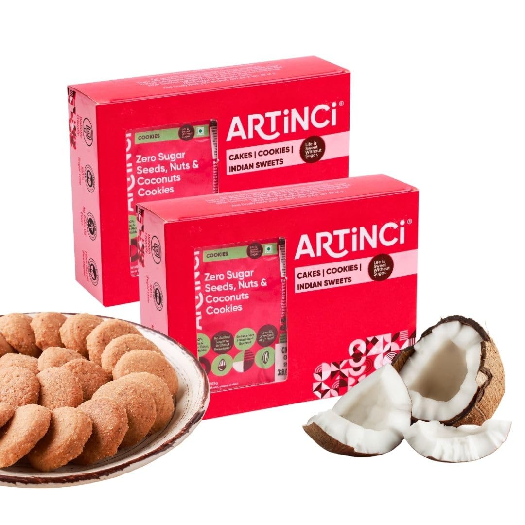 HomeGrocerySnacksCookiesArtinci Coconut Cookies | As Seen on Shark Tank |Sugar Free Diabetic Friendly with High Protein & Fiber Digestive Biscuits | Low GI & Carbs | (185g x Pack of 2)