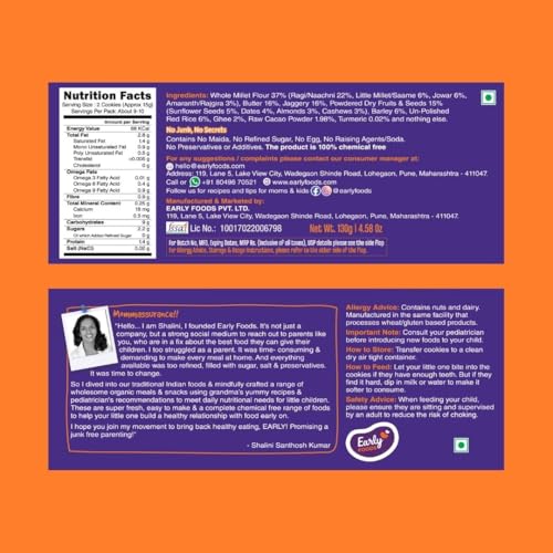 Recommended for little ones who are ready for all grains & nuts. Best if they have 1-2 teeth to chew. If not you can always dip in milk to help them bite. These Ragi biscuits are made from organically certified whole wheat millets pulses Organic Jaggery Indian grown cacao powder superior quality dry fruits & seeds that add natural vitamin and mineral supplements to your child's diet. 2 Assorted Packs. Contains ~18-20 pieces each. How are Early Foods Cookies Different & Special? - Freshly prepared batch of jaggery biscuits for little ones & grownup's once you order online. Because children need freshly made foods for maximum nutrient absorption - Made from Organically Certified Whole Grains and 0% Maida - No Baking Powder No Soda No Raising Agents No Egg - 0% Sugar Sweetness from Organic Jaggery and Dates - No hydrogenated fats. Made from pure cow butter. - No Preservatives or Artificial Flavours Ingredients: Organic Whole Grains (Ragi Amaranth Wheat) Cow Butter Organic Jaggery Dry Fruits (Almonds Pista Cashews Dates Walnuts Watermelon Seeds Sunflower Seeds) Organic Raw Cacao Powder Milk. Shelf Life: Best before 4 months from MFD. Consume before 1 months from opening the pack. Best to store in a dry steel or glass air tight container. Why Moms love Early Foods: - Made from ancient Indian Super Foods - We make really small batches of food each day. So you can always feed super fresh meals. - Grandma inspired recipes simple healthy with minimal processing - No Sugar or salt. - No Preservatives colours or artificial flavours. All Natural
