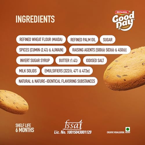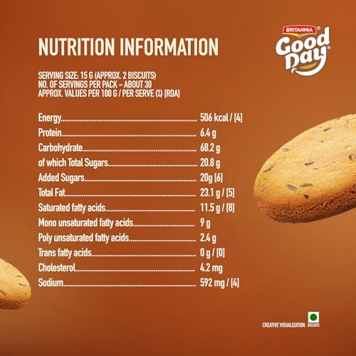 Bite into our delectable & crispy Good Day Butter Jeera cookies. Infused with the warmth of aromatic jeera (cumin) and buttery goodness these cookies offer a perfect blend of sweet and salty flavours. Each bite is a flavourful experience that perfectly complements your tea break making them an ideal choice for a satisfying snack. Enjoy the unique taste of these delectable treats that elevate the classic cookie to a new level of deliciousness.