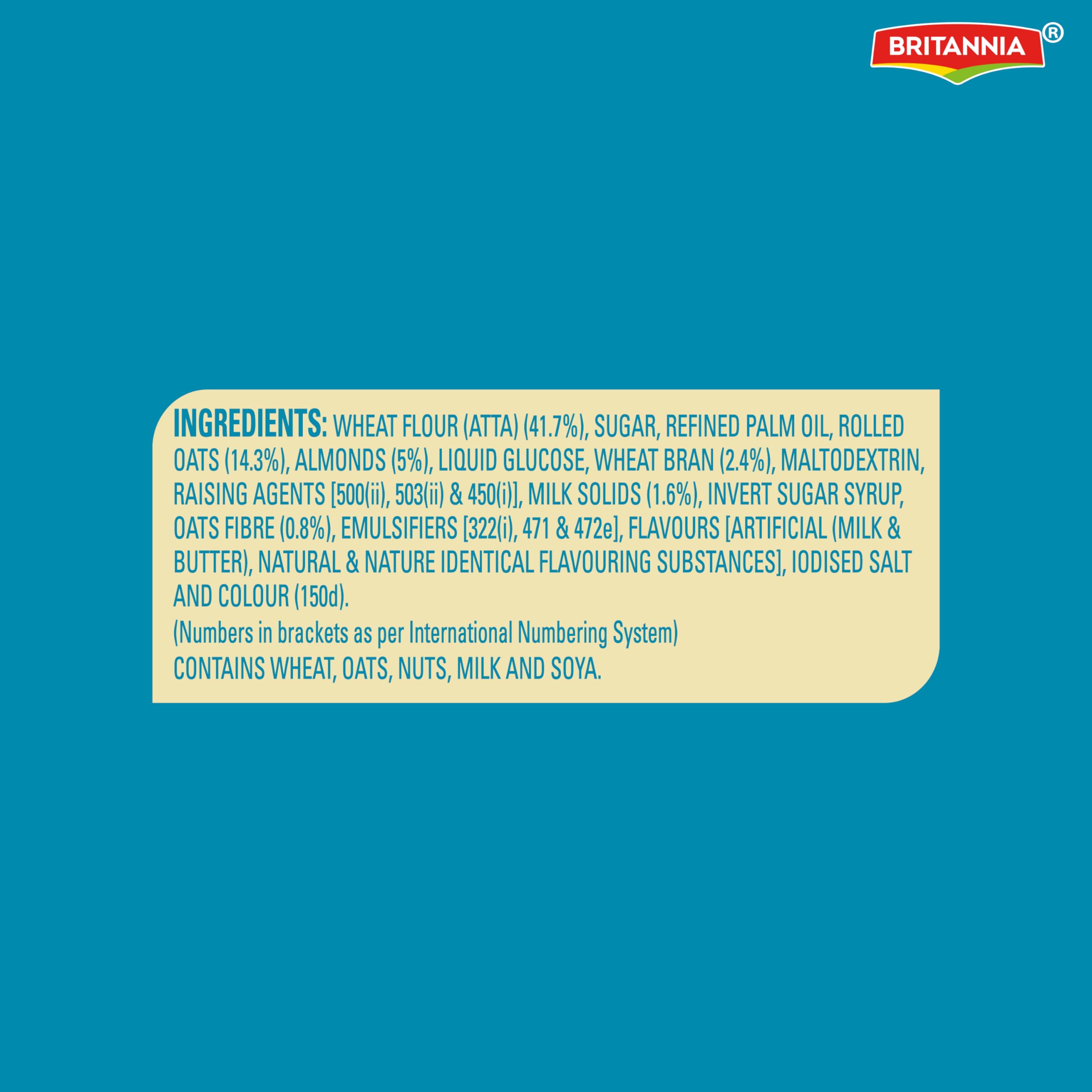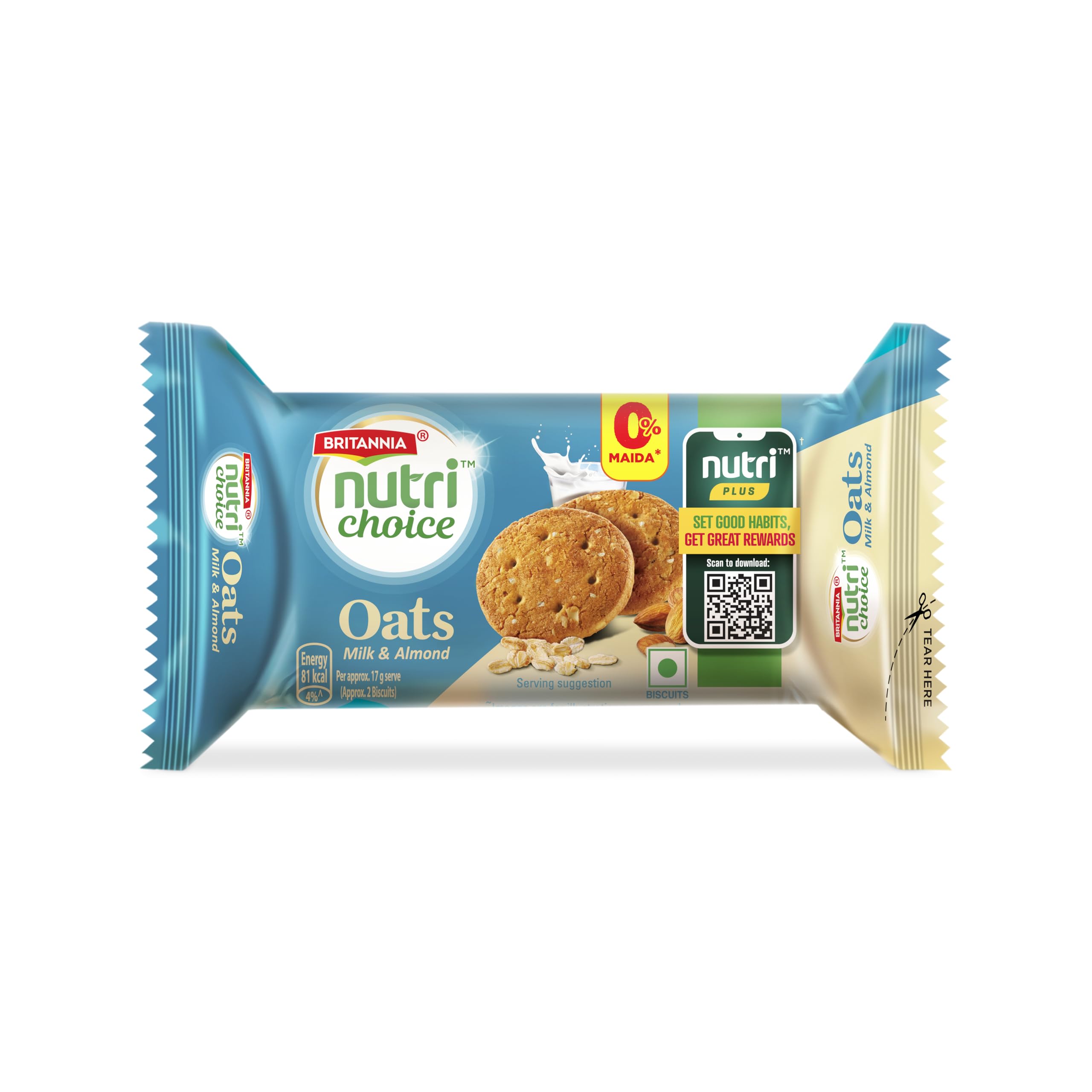 Britannia NutriChoice Oats Almond and milk Cookies are a delightful healthy snack which is a mix of rolled Oats wheat bran chocolate and almonds. These high fibre Oats and almond biscuits are perfect for whenever you want to snack on healthy biscuits. They are also yummy cookies when you want to snack on something tasty. Go ahead and make a good choice.