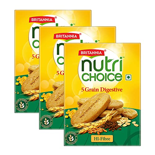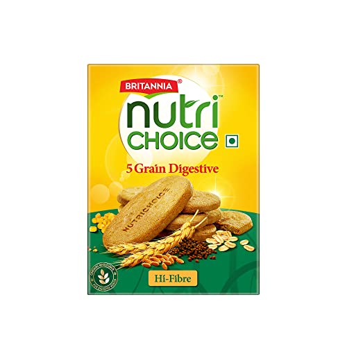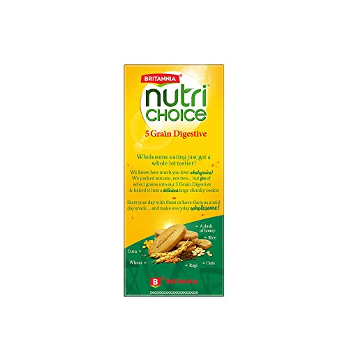 Britannia NutriChoice 5 Grain Digestive are multigrain high fibre healthy biscuits that include Oats Ragi Wheat Corn and Rice. This healthy snack is fibre rich and has the goodness of honey. This uniquely shaped biscuit serves as a perfect healthy snack that is also extremely filling.