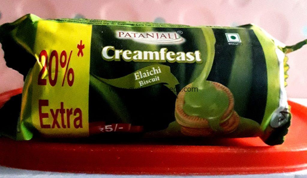 Patanjali Creamfeast Elaichi biscuit is a cream-filled sandwich cookie that has zero percent maida, cholesterol, and transfat. It has an amazing taste and provides more fiber and nutrition.*Rich in protein.*Rich in dietary fibre.*Source of iron.whole wheat flour, sugar, edible vegetable oil(palm), milk solids, starch, dextrose, invert syrup, raising agent, edible common salt, malt extract, soya lecithin, dough conditioners, acidity regulators