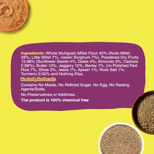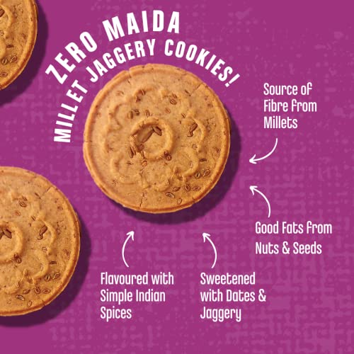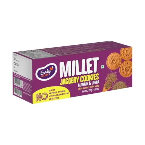 These Millet Cookies recommended for kids who are ready for all grains & nuts. Best if they have 1-2 teeth to chew. If not you can always dip in milk to help them bite. These cookies are made fromMillets pulses Jaggery Superior quality dry fruits & seeds that add natural vitamin and mineral supplements to your child's diet. Ajwain & Jeera Jaggery Cookies Pack. Contains ~18-20 pieces each. How are Early Foods Cookies Different & Special? - Freshly prepared batch of jaggery cookies for little ones & grownup's once you order online. Because children need freshly made foods for maximum nutrient absorption - Made from Whole Grains and 0% Maida - No Baking Powder No Soda No Raising Agents No Egg - 0% Sugar Sweetness from Jaggery and Dates - No hydrogenated fats. Made from pure cow butter. - No Preservatives or Artificial Flavours Ingredients: Whole Wheat Millet Flour Powdered Dry Fruits (Almonds Dates Sunflower Seeds Cashews) Butter Barley Handpounded Red Rice Jeera Ajwain Rock Salt and Nothing Else Shelf Life: Best before 4 months from MFD. Consume before 2 months from opening the pack. Best to store in a dry steel or glass air tight container. Why Moms love Early Foods: - Made from ancient Indian Super Foods - We make really small batches of food each day. So you can always feed super fresh meals. - Grandma inspired recipes simple healthy with minimal processing - No Sugar or salt. - No Preservatives colours or artificial flavours. All Natural