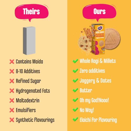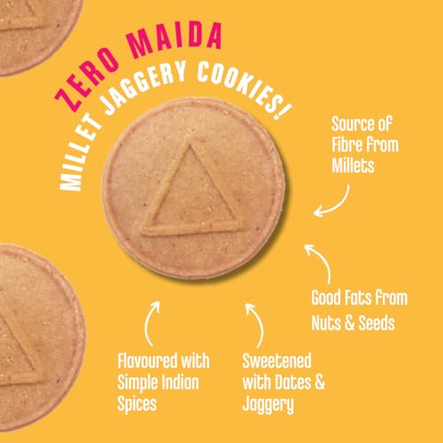 Ragi & Sesame Cookies Ingredients : Powdered Dry Fruits 17% (Dates Sunflower Seeds Almonds Cashews) Butter 17% Ragi/Naachni 12% Amaranth/Rajgira 12% Jaggery 16% Little Millet/Saame Barley Hand-pounded Rice Jowar Sesame Seeds 4% Nutmeg and nothing else.