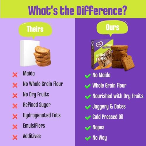 100% CLEAN Ingredients: Our Millet Rusk is crafted with a nutritious blend of millets whole wheat jaggery/gur cold-pressed groundnut oil almonds assorted nuts and seeds. It's wholesome and a guilt-free Millet Toasts.