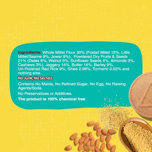 Ingredients Include Butter 22% Powdered Dry Fruits & Seeds 18% (Dates Sunflower Seeds 6% Almonds 4% Cashews) Foxtail Millet 12% Jaggery 19% Little Millet/Saame 9% Jowar 9% Barley Hand-pounded Rice Nutmeg and nothing else