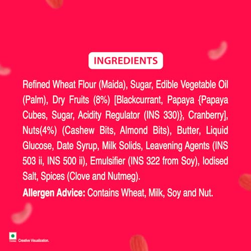 Refined Wheat Flour (Maida) Sugar Edible Vegetable Oil (Palm) Dry Fruits (9%) [Black Currant Papaya {Papaya Cubes Sugar Acidity Regulator(E330)} Cranberry] Nuts (5%) (Cashew Almond Bits) Butter Liquid Glucose Date Syrup Milk Solids Leavening Agents (E503i