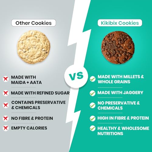 HomeGrocerySnacksCookiesKikibix Choco Chip Cookies | No Refined Sugar No Maida No Preservatives | Made with Jowar & Jaggery | Healthy Multigrain Millet Snack for Kids & Adults | 130gm (Pack of 2) | 24 Pieces