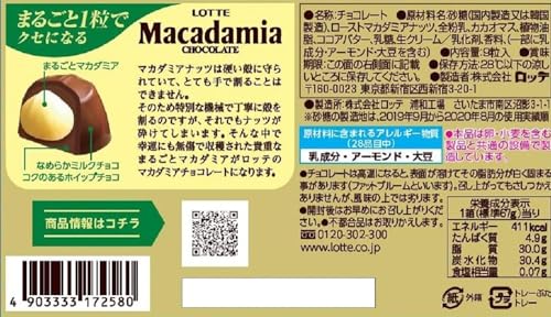 Macadamia chocolate with the addictive taste of carefully selected whole macadamia that will make you want to eat it one after another. A whole macadamia is slowly roasted and wrapped in two layers of whipped and milk chocolate. By wrapping the macadamia in soft whipped chocolate you can fully enjoy the texture of each macadamia. Enjoy a luxurious time with Lotte's macadamia chocolate. Raw materials/components Sugar (made in Japan or South Korea) roasted macadamia nuts whole milk powder cacao mass vegetable oil cocoa butter lactose fresh cream/emulsifier fragrance (contains milk ingredients almonds and soybeans in part)