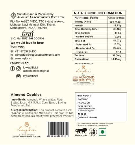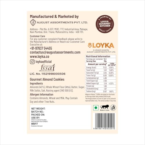 Introducing our delicious almond cookies a perfect addition to your tea-time snacking ritual. Our cookies are made with high-quality ingredients that ensure every bite is a taste of indulgence. These cookies are a better-for-you snacking option that will satisfy your cravings while keeping your health in mind. Our almond cookies is that they are made with almond flour instead of refined flour (maida) which makes them a healthier alternative. Almond flour is rich in nutrients including vitamin E protein and healthy fats. This gives our cookies a delightful nutty taste and a dense yet delicate texture that is sure to please your taste buds. To enhance the nutty flavor and add a satisfying crunch we have included almond chunks in every cookie. These almond chunks add a delightful texture and taste making our cookies a delightful treat. Our almond cookies are perfect for those looking for a better-for-you snacking option. They are lower in carbohydrates than traditional cookies and the natural sweetness from the almonds means we don't need to use excessive amounts of sugar. Our cookies come in a box of 12 pieces perfect for sharing with your family and friends during your next tea time get-together. Indulge in these cookies without feeling guilty as you enjoy the great taste and aroma of natural almonds in every bite. Our almond cookies are perfect for any occasion whether it's a casual snack or a special treat for yourself or your loved ones. They are ideal for pairing with tea or coffee and their nutty aroma and flavor perfectly complement a range of beverages. So if you're looking for a delicious and healthy treat our almond cookies are the perfect choice. We are confident that you will love every bite and appreciate the effort we have put into creating these delightful treats. Indulge in the nutty goodness of our almond cookies and experience the perfect balance of taste and health!