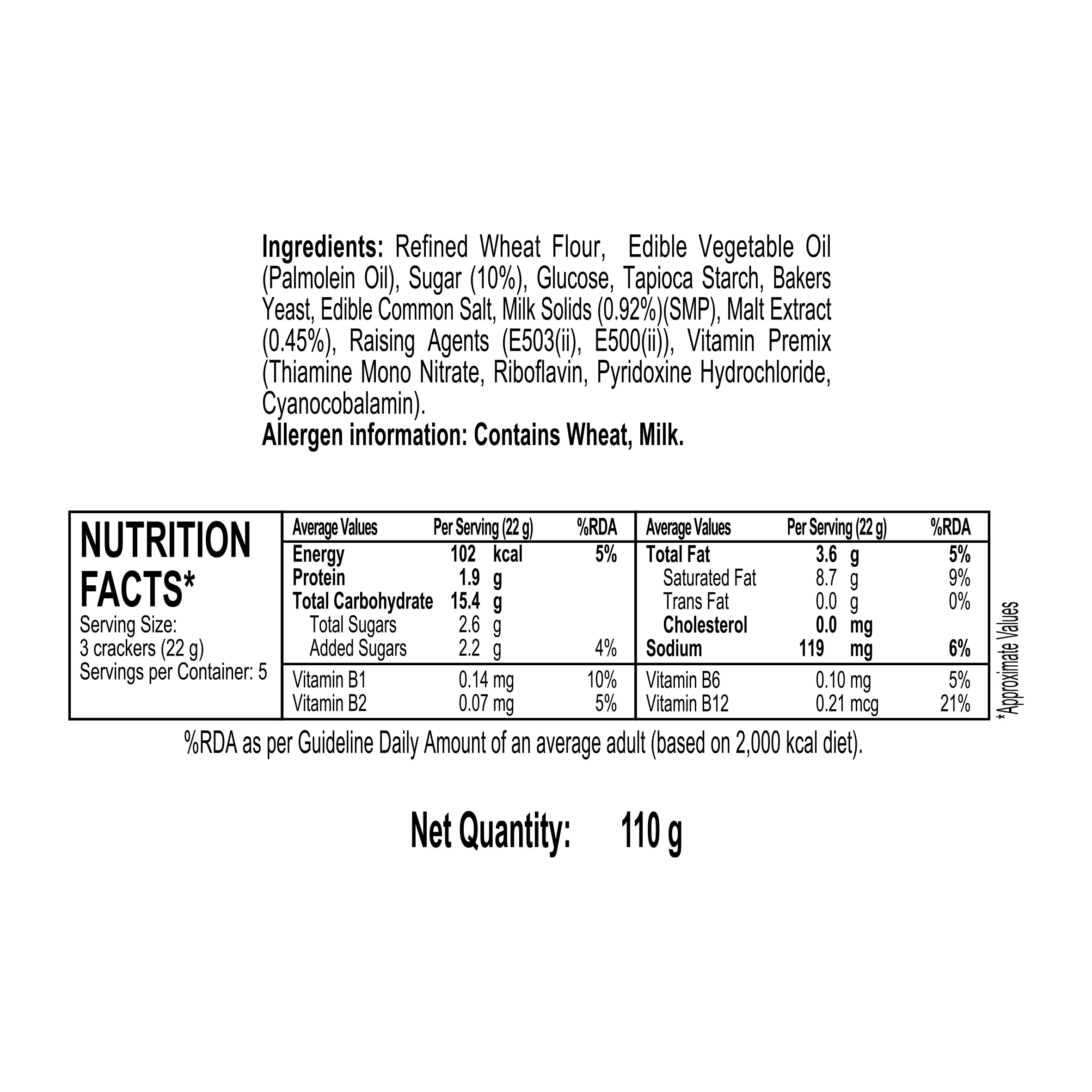 Malkist is a very unique cracker with each biscuit made out of 7 crunchy layers. It comes with delicious and innovative toppings like Cheese Chocolate Cappuccino and Caramelized Sugar make it irresistible. Refined Wheat Flour Edible Vegetable Oil (Palmolein) Sugar (10%) Tapioca Starch Glucose Milk Solids (0.92%) (SMP) Malt Extract (0.45%) Edible Common Salt Bakers Yeast Leavening Agent (E503(ii) E500(ii)) Vitamin Premix (Thiamine Mononitrate Riboflavin Pyridoxine Hydrochloride Cyanocobalamin)