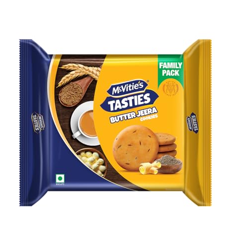 1. Savory Twist: Unlike traditional sweet cookies McVitie's Tasties Butter Jeera Cookies feature the aromatic and savory flavor of cumin (jeera) providing a unique taste experience. 2. Rich Butter Flavor: The generous use of butter gives these cookies a rich melt-in-your-mouth texture and a satisfying buttery flavour.
