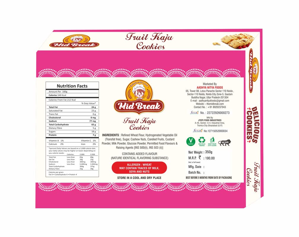 Fruit Kaju cookies marketed by MidBreak are baked with 100% real Kaju and fruits. These biscuits are sweet and crisp. The cookies are made with high-quality ingredients. These biscuits are a healthy alternative to other unhealthy snacks. They are a great snack for breakfast or afternoon tea. You can buy and send them to your loved ones as a gift. You can also keep some packets in your pantry for quick snacking. Midbreak cookies are made with utmost love and care. We always try to serve you with the best we can. Midbreak cookies are 100% eggless and vegetarian cookies.
