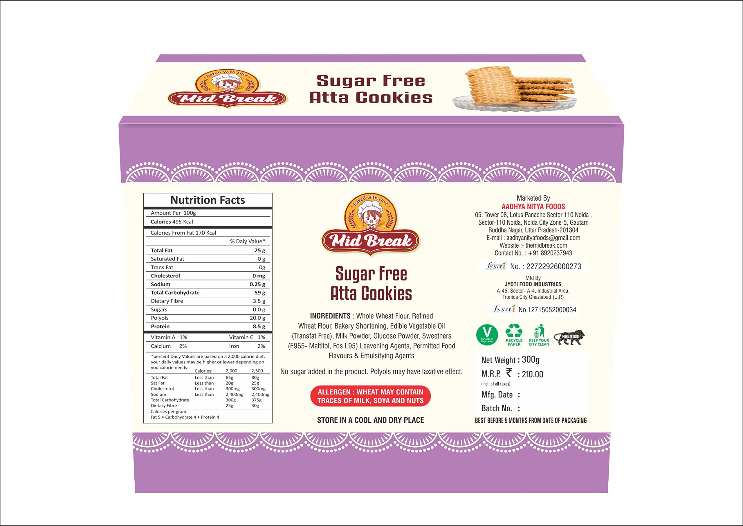 Midbreak cookies are wholesome blend of healthy and natural ingredients. With every bite our cookies melt in your mouth, giving you a rich flavour of all those natural ingredients. Why choose maida cookies when you have healthy and tasty atta cookies. Midbreak cookies are made with utmost love and care. Midbreak sugar free atta cookies are perfect for gifting purpose to all age groups.