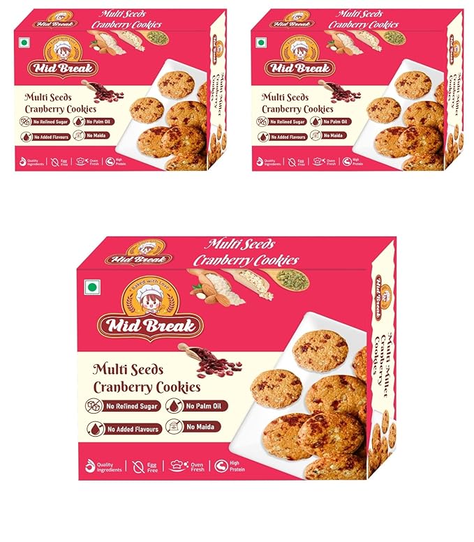 Midbreak Multi Seeds Cranberry Oats Cookies - Gluten-Free, No Refined Sugar, Made with Sorghum, Almond, and Oats Flour - Healthy, Nutritious, and Delicious | Pack of 3 | 600g