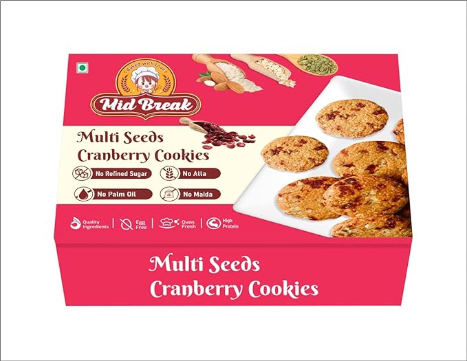 Indulge in the wholesome goodness of Midbreak Multi Seeds Cranberry Oats Cookies, a delicious and nutritious snack that supports your healthy lifestyle. These gluten-free cookies are thoughtfully made with a blend of sorghum flour, almond flour, and oats flour, providing a rich, nutty flavour and a tender texture. Sweetened with natural alternatives and containing no refined sugar, these cookies are a guilt-free treat. They are packed with the tangy sweetness of cranberries and the crunch of multi seeds, delivering a delightful taste experience with every bite. The seeds add an extra boost of healthy fats, fiber, and essential minerals, making these cookies a powerhouse of nutrition. Perfect for those with gluten sensitivities or anyone looking to enjoy a healthier snack, these cookies are ideal for kids' lunchboxes, afternoon tea, or a post-workout treat. Conveniently packaged, they are also perfect for busy mornings, travel, or any time you need a quick and healthy snack on the go. Choose Midbreak Multi Seeds Cranberry Oats Cookies for a snack that's as nutritious as it is delicious. Enjoy the balance of wholesome ingredients and satisfying flavours that support your health and well-being.