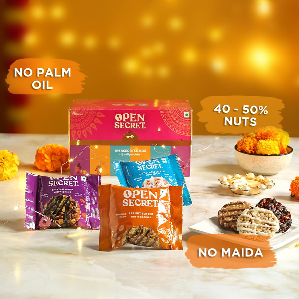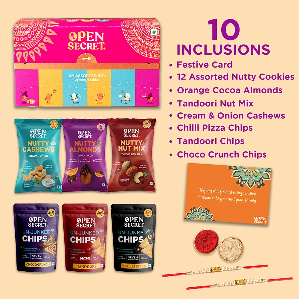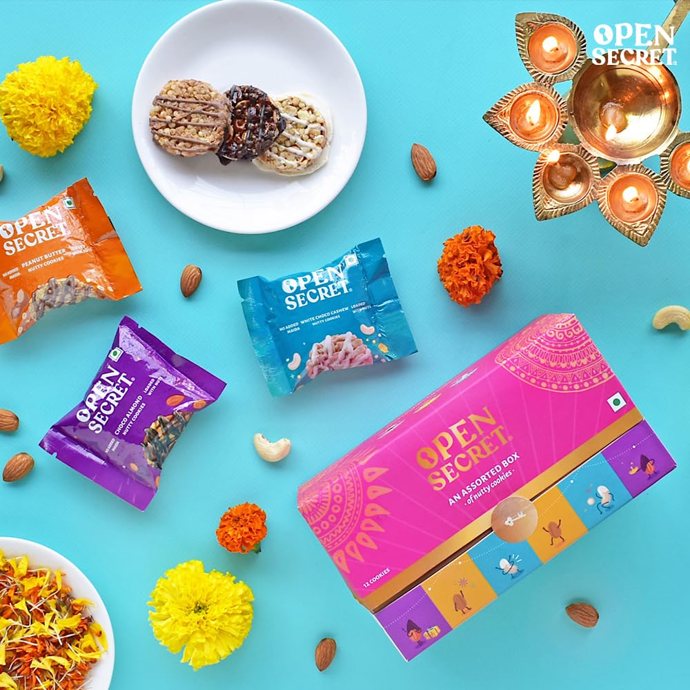 HomeGrocerySnacksCookiesOpen Secret Holi Gift Box | Combo of 11 | Dry Fruits Gift Box, Cookies, Chips, Gift Hamper, Holi Gift Hampers, Gift Set, Corporate Gifts for Employees with Greeting Card