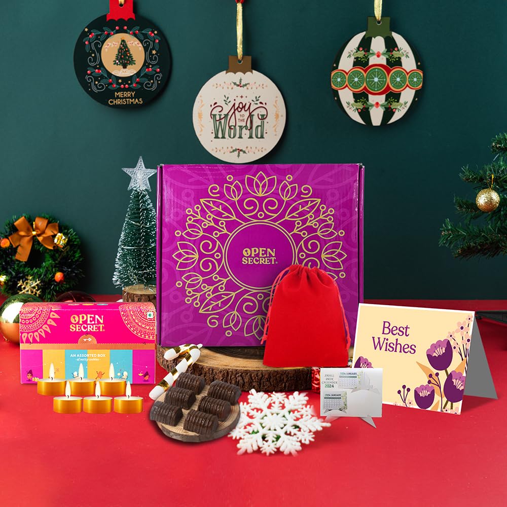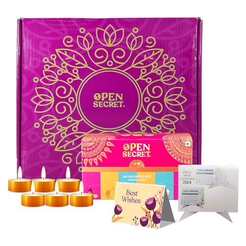 Open Secret Gift Hamper | 7 Item Gift Combo - Gift Box, Card, Scented Candles (Pack of 6), Assorted 12 Cookies, Calendar | Healthy Unjuncked Food | Gift for Corporate, Family, Friends