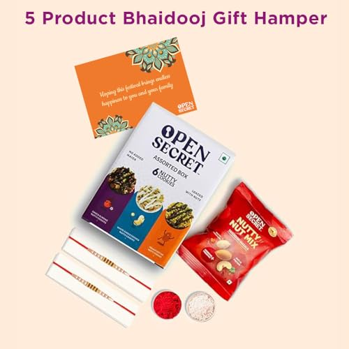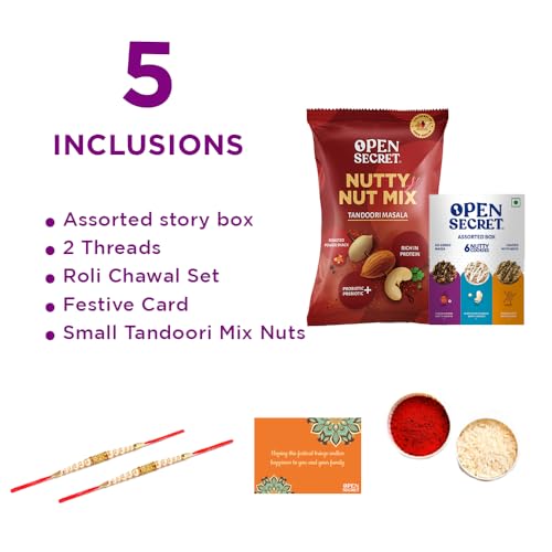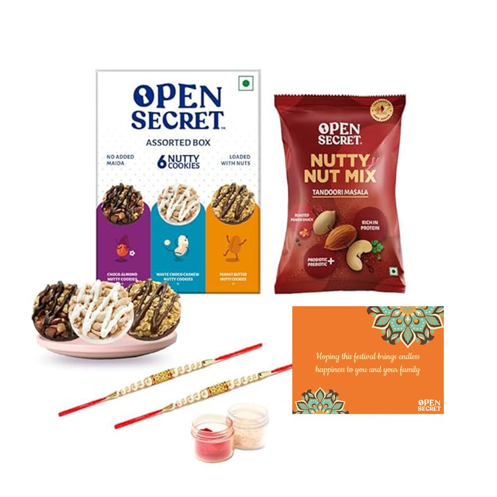 Open Secret Rakhi Gift Hamper for Brother I Cookies Biscuits Tandoori Masala Nuts Mix (23g) Roli Chawal Rakhi (x2) Rakhi Card I Rakhi for Brother Sister | Healthy Gift Hamper