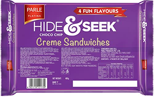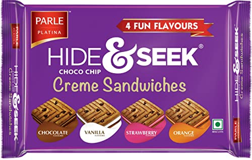 Parle Hide & Seek Fab Chocolate Choco Chip Cookies completes your command by offering you Chocolate flavored cookies with immense quantity cream consistently spread covering all the four corners of it.