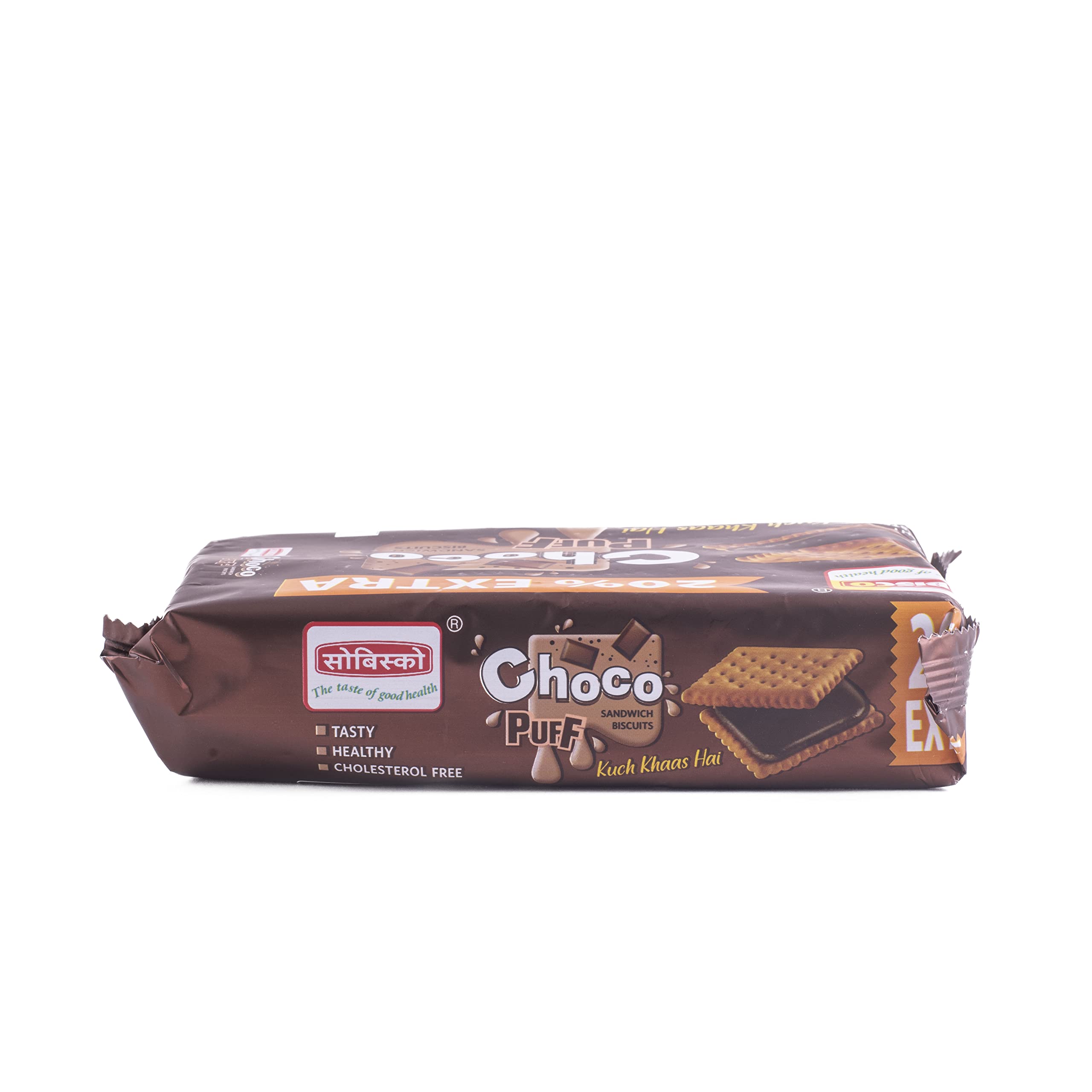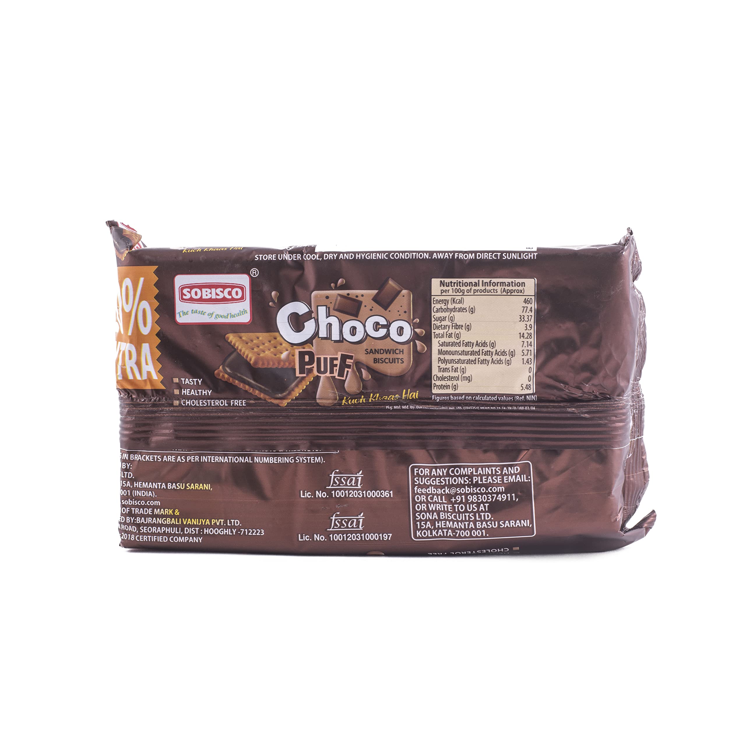 "SOBISCO Choco Puff Sandwich Cream Biscuits Tasty Healthy and Cholesterol Free : - SOBISCO - The taste of good health Amazing Creation to suits your taste On a journey to treat the nation and beyond with the best in taste and health Sobisco started its story more than a couple of decades ago. The mission was to create a name that would stand for quality and wholesome goodness. The vision being to give people the gift of nutrition. Established in 1992 this flagship brand of Sona Biscuits has come a long way with its current annual production of 100000 tonnes. The power to gift its customers over 100 varieties of products ranging from sweet to savoury biscuits along with delicious cakes has made Sobisco a force to be reckoned within the FMCG sector : : -:Disclaimer: - Despite our attempts to provide you with the most accurate information possible the actual packaging ingredients and colour of the product may sometimes vary. Please read the label directions and warnings carefully before use. - Choco Puff Sanwich cream biscuits : Perfect for Anytime Munching : Amazing Creation to suits your taste : Tasty healthy and Cholesterol free : : : Stroage Instruction : - Store under cool dry and hygienic place - Keep away from direct sunlight : : Nutritional Facts : - Energy - 460 kcal Protein - 5.48g"