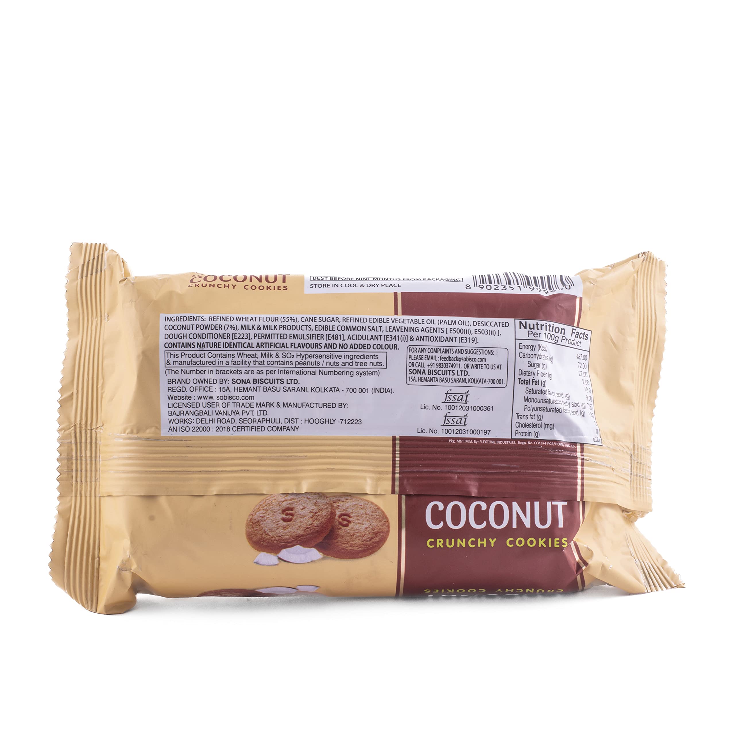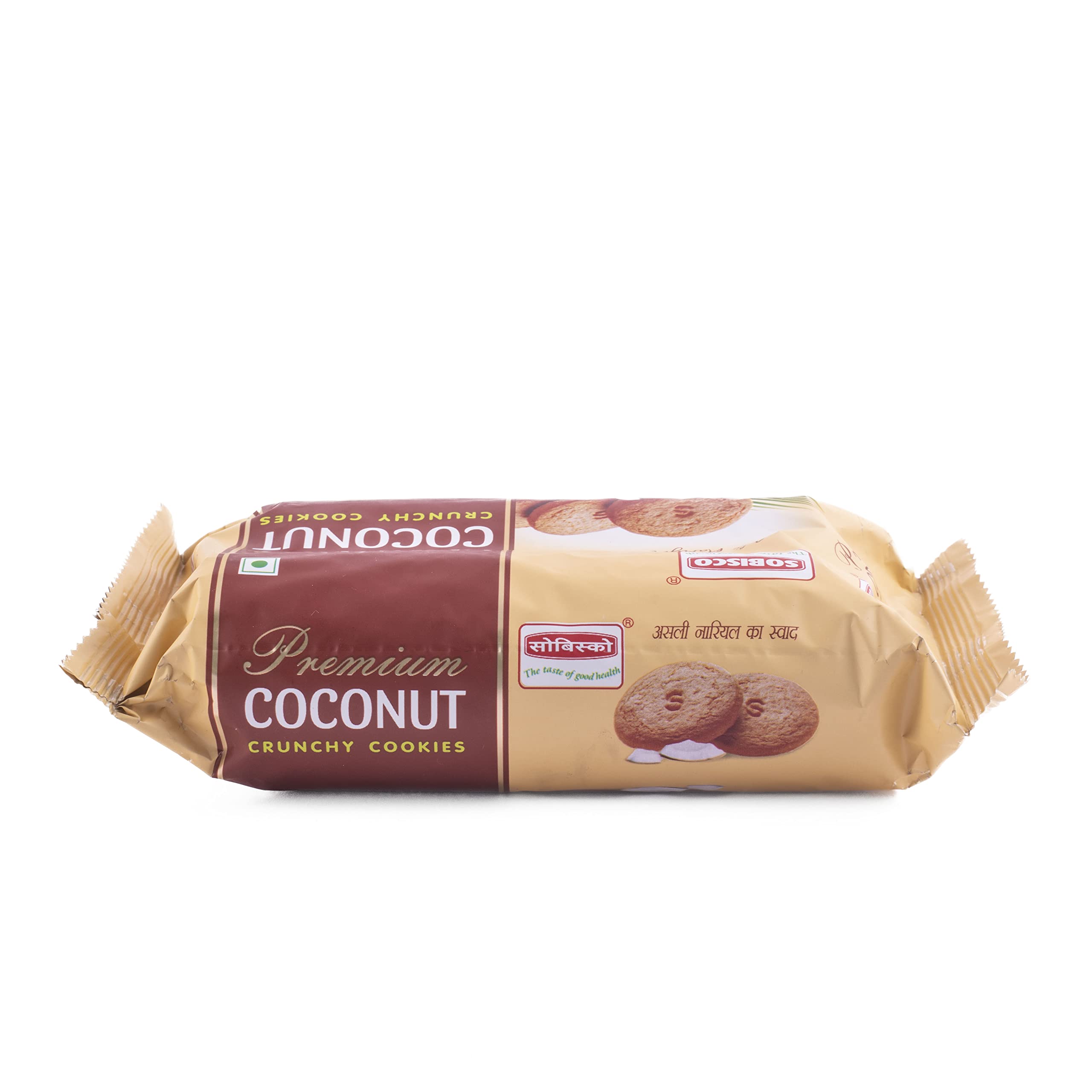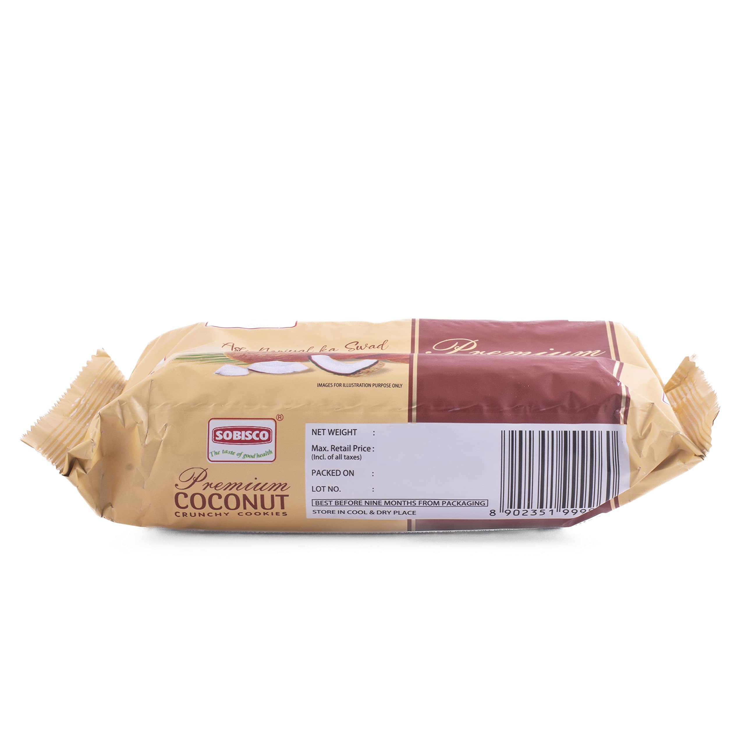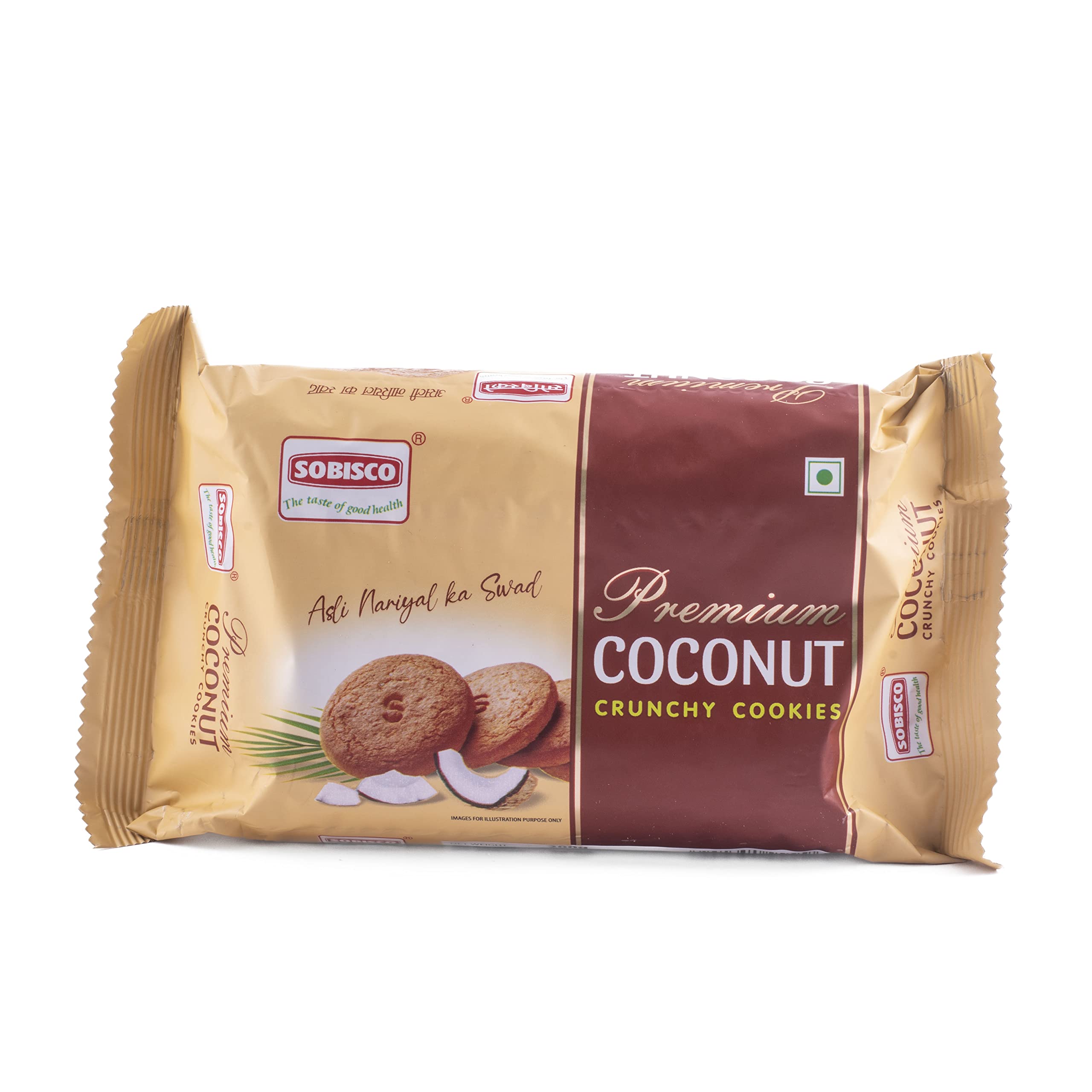 "ABOUT US : TIMELINE JOURNEY On a journey to treat the nation and beyond with the best in taste and health Sobisco started its story more than a couple of decades ago. The mission was to create a name that would stand for quality and wholesome goodness. The vision being to give people the gift of nutrition. Established in 1992 this flagship brand of Sona Biscuits has come a long way with its current annual production of 100000 tonnes. The power to gift its customers over 100 varieties of products ranging from sweet to savoury biscuits along with delicious cakes has made Sobisco a force to be reckoned within the FMCG sector. :- Asli Nariyal ka swad Premium Coconut Crunchy Cookies Store in cool dry and hygienic place keep away from direct sunlight Perfect for Anytime Munching Amazing Taste :- Energy - 487 kcal Fat - 18g Protein - 6.30g : Packaging May Vary - Weight of the product may vary"