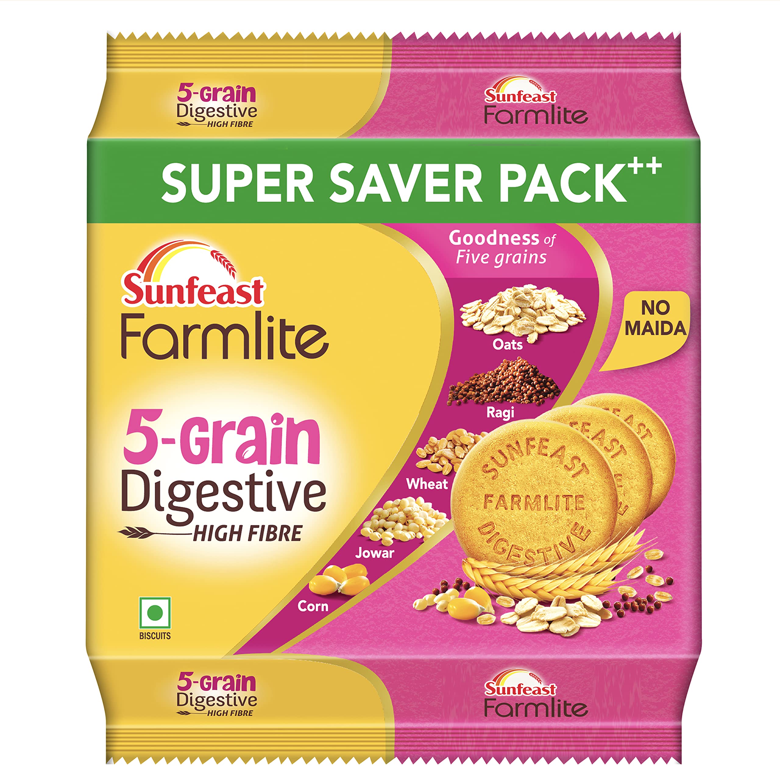Sunfeast Farmlite 5 Grain Digestive Biscuit High Fibre Biscuit Goodness of 5 Grains 800 g PackHereâs a tasty way to power through the day. The Sunfeast Farmlite 5 Grain Digestive Biscuit is a High Fibre biscuit thatâll give you the power to seize the day. It is made with the goodness of five grains like Ragi Oats Jowar Corn and Wheat. These five super grains will keep you energised to live a multitasking life. Rich in fibre Sunfeast Farmlite 5 Grain Digestive Biscuit is not just any digestive it's DiZESTive and takes care of all your dietary requirements to keep you active to complete all your dayâs tasks. Made with the best quality ingredients that are sourced from the choicest farms in India. They contain no maida and are made using Aashirvaad atta and the goodness of those 5 grains. Baked to that perfect golden-brown crunch these biscuits are not only good for you but also taste amazing. Pair it with your tea and you are in for a treat. So add this delicious biscuit to your tea-time routine and take a bite of some crunchy goodness every day.Mom's Magic Rich Cashew Almond Cookies | Roasted Cashew Almond | Rich Butter Biscuits | Mom's Favourite Baked Cookies 584gMom's Magic Cashew Almond Cookies - Just the way Mom would make it. Nutty cookies Mom's Magic are loaded with choicest cashews and almonds which are roasted to perfection for a rich full-bodied taste. Complemented with roasted Butter that has mildly sweet caramel notes which give a unique flavour and rich smoothness to Mom's Magic Biscuits. A perfect tea time snack these cookies are your 4pm companion for when you want a bite of sweet nuttiness that envelops your senses just like a mom's hug. Enjoy these baked biscuits and step into a world abundant with warmth heartfelt hugs and mom's magical taste