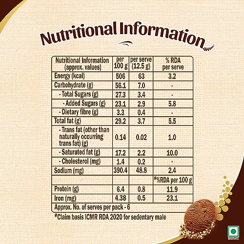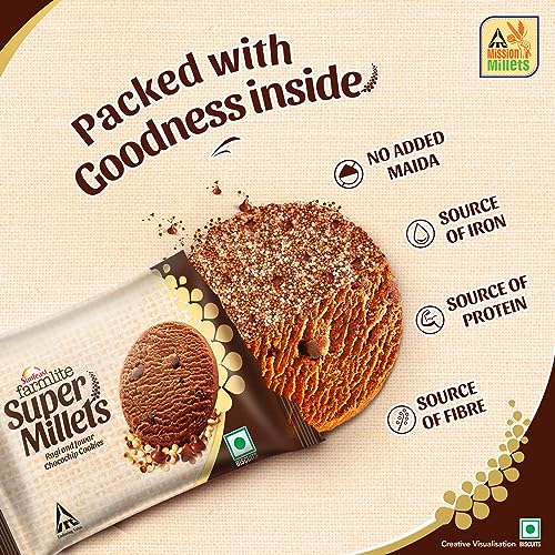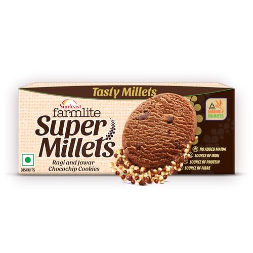 Savor the delicious combination of flavors and delightful crunch of the all-new Sunfeast Farmlite Super Millets Ragi and Jowar Chocochip Cookies. A crispy tasty snack-time treat that will delight your taste buds. Infused with the goodness of millets such as Ragi and Jowar these cookies are further elevated with the addition of delectable choco chip bits enhancing their flavor to perfection. They contain no maida and are instead packed with the nutritional benefits of millets including iron protein and fiber. Our Master Bakers have meticulously developed a recipe to ensure a pleasantly surprising taste without compromising on flavor. Make these millet biscuits your go-to snack to satisfy your mid-meal hunger pangs or when you need something to munch on with your cup of coffee. Each conveniently packaged pack contains 6 cookies ensuring you have plenty to enjoy.With 2023 being the 'International Year of Millets' ITC has embarked on its Mission Millets to celebrate these grains that are a part of India's rich culinary heritage. As a part of this mission ITC has launched Sunfeast Farmlite Super Millets Ragi and Jowar Cookies and Sunfeast Farmlite Super Millets Ragi and Jowar Chocochip Cookies.So get yourself a pack of Sunfeast Farmlite Super Millets Cookies and experience the perfect blend of taste and crunchiness that's sure to be loved by all.