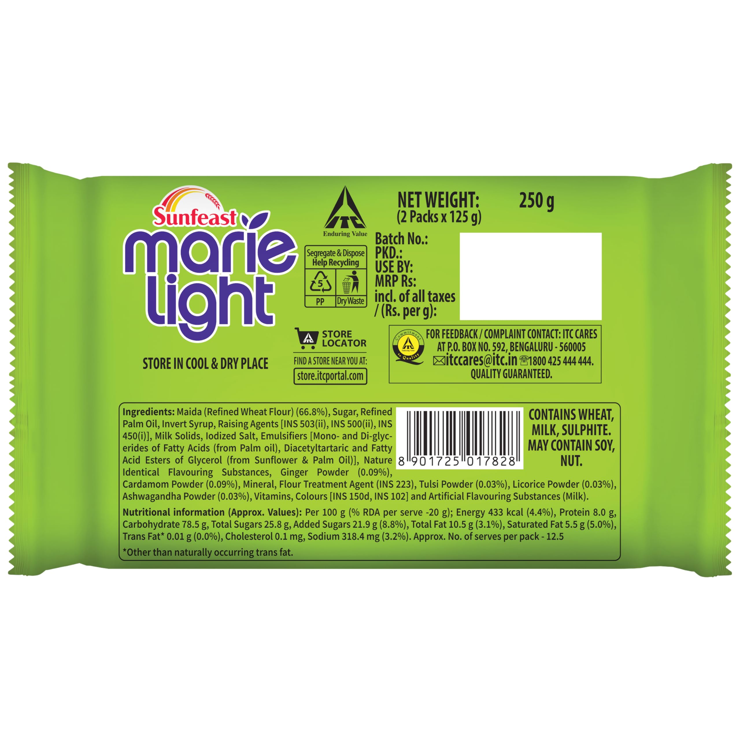 Marie biscuits with a hot cup of tea are not just a habit for some of us; it's a cherished ritual that we all love. Sunfeast Veda Marie Light biscuits are here to make your tea-time both fun and nourishing. Packed with the goodness of natural ingredients these biscuits help you stay on top of your game throughout the day. Enjoy them with your morning tea or savour a biscuit while taking a break from everyday work. Sunfeast Veda Marie Light is the natural partner for your chai. This incredible Marie biscuit is not only delightful in taste but also rich in goodness. It's crafted with the benefits of five natural ingredients like Tulsi Ginger Cardamom Ashwagandha and Mulethi. For all the Marie biscuit lovers out there Sunfeast Veda Marie Light is the perfect tea-time companion you've been searching for. It is the first biscuit with the goodness of 5 natural ingredients which find a prominent place in ancient ayurvedic wisdom - Ashwagandha Tulsi Mulethi Adrak & Elaichi. Its remarkable taste and inherent goodness is what makes it chai ka natural partner.